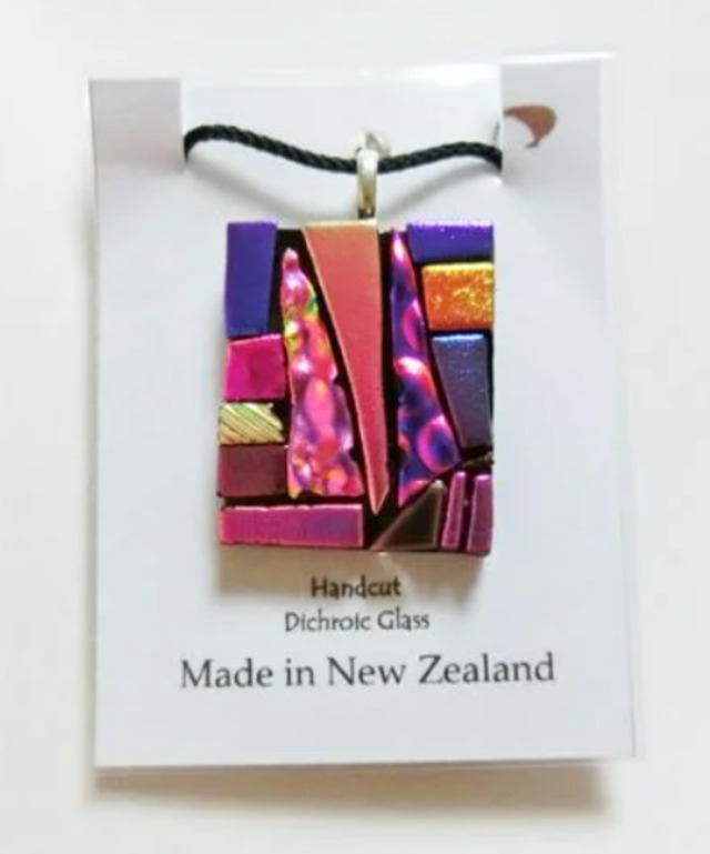 クライストチャーチ在住のガラスジュエリー作家ドナさんの「Firedsand Studio」 様々な色、形を組み合わせた美しいガラスアートが魅力的です。 いろいろな色・形のガラスを立体的に組み合わせた、大きめなネックレスです♪ 角度によってパープルからピンク系に色が変化します。 独創的なデザインとキラキラ輝くガラスが、コーディネートのポイントになるアイテム。 手作りの一点物です。自分用はもちろん、プレゼントにも最適な1点です。 サイズ:ヘッド 2.8×3.5cm 紐の長さ 45cm ※ガラス製ですので、硬いものにぶつけたり落としたりすると欠けてしまう恐れがあります。お取扱いにご注意ください。 クリックポスト対応商品