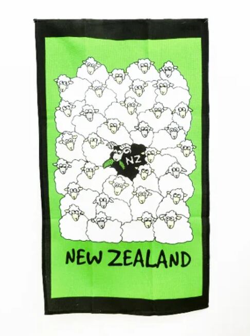 黒い羊を取り囲むたくさんの白い羊が描かれた、可愛いデザインのティータオルです♪