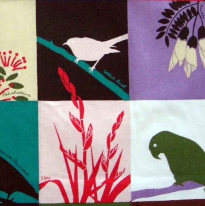 ニュージーランドで見ることのできる、鳥や植物がカラフルに描かれている