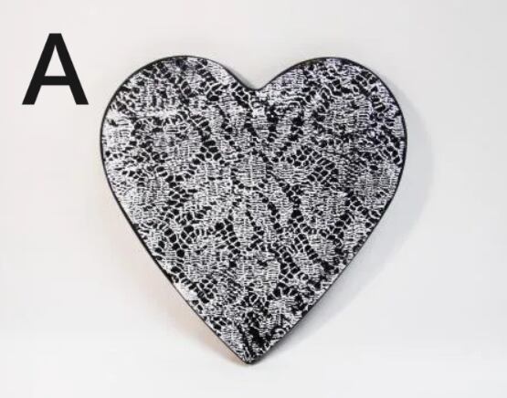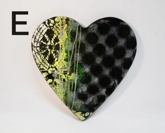 ハート型の木の板に、油性絵具で何度も色や模様を重ねて作り上げています。