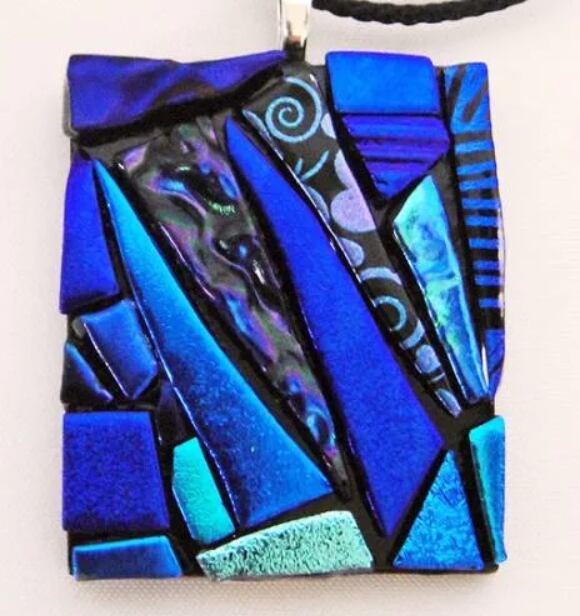 ブルーの様々な形のガラスをパズルのように組み合わせた、大きめなネックレスです♪
