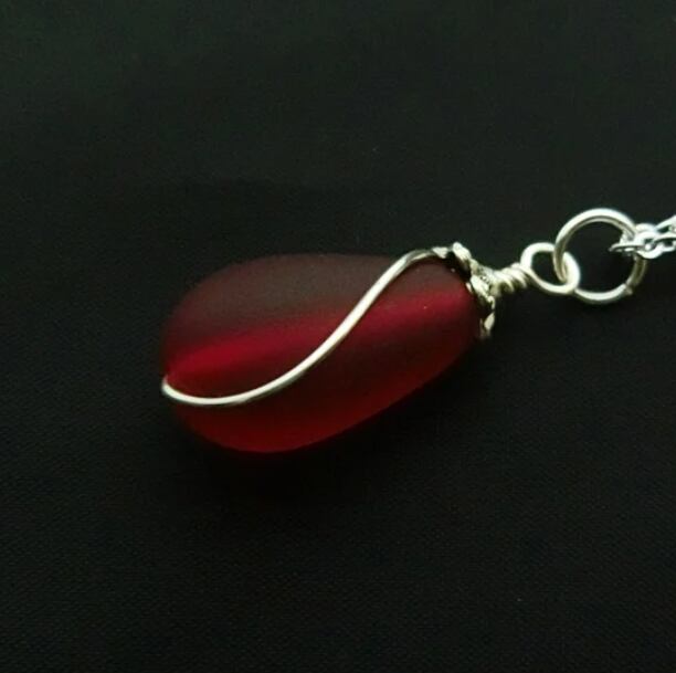ラズベリーレッドの雫形のガラスに、シルバーの針金が巻きついた