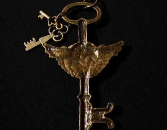 大きな羽の付いた鍵に、ヴィンテージの腕時計仕掛けを組み合わせた