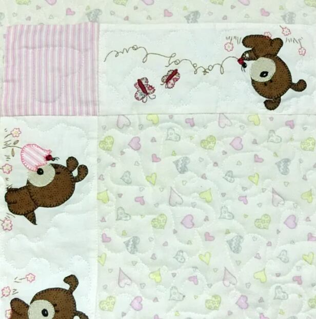 子犬が遊んでいるデザインにハートの柄がCuteなパッチワークキルト♪